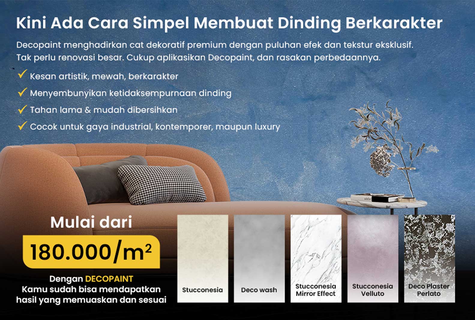 Decopaint adalah merek produk cat dekoratif yang di produksi oleh PT. KREASI KARYA PAINTINDO. Kami adalah perusahaan cat dekoratif yang berpengalaman sejak tahun 1999 dan kami adalah produsen atau pemasok dan menawarkan berbagai macam cat dekoratif dan pelapis khusus yang dirancang untuk menciptakan hasil akhir yang unik dan menarik secara visual pada permukaan tembok/dinding, kayu, triplek, gypsum. Perusahaan kami menyediakan produk cat dekoratif untuk penggunaan interior dan eksterior, melayani Pengembang perumahan, kontraktor, pasar perumahan dan komersial.